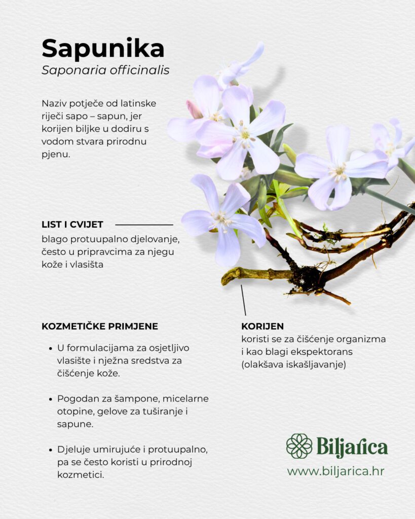 Sapunika je stoljećima korištena upravo u tu svrhu — njezini saponini stvaraju blagu pjenu koja čisti kosu i vlasište, a pritom ne isušuje.
