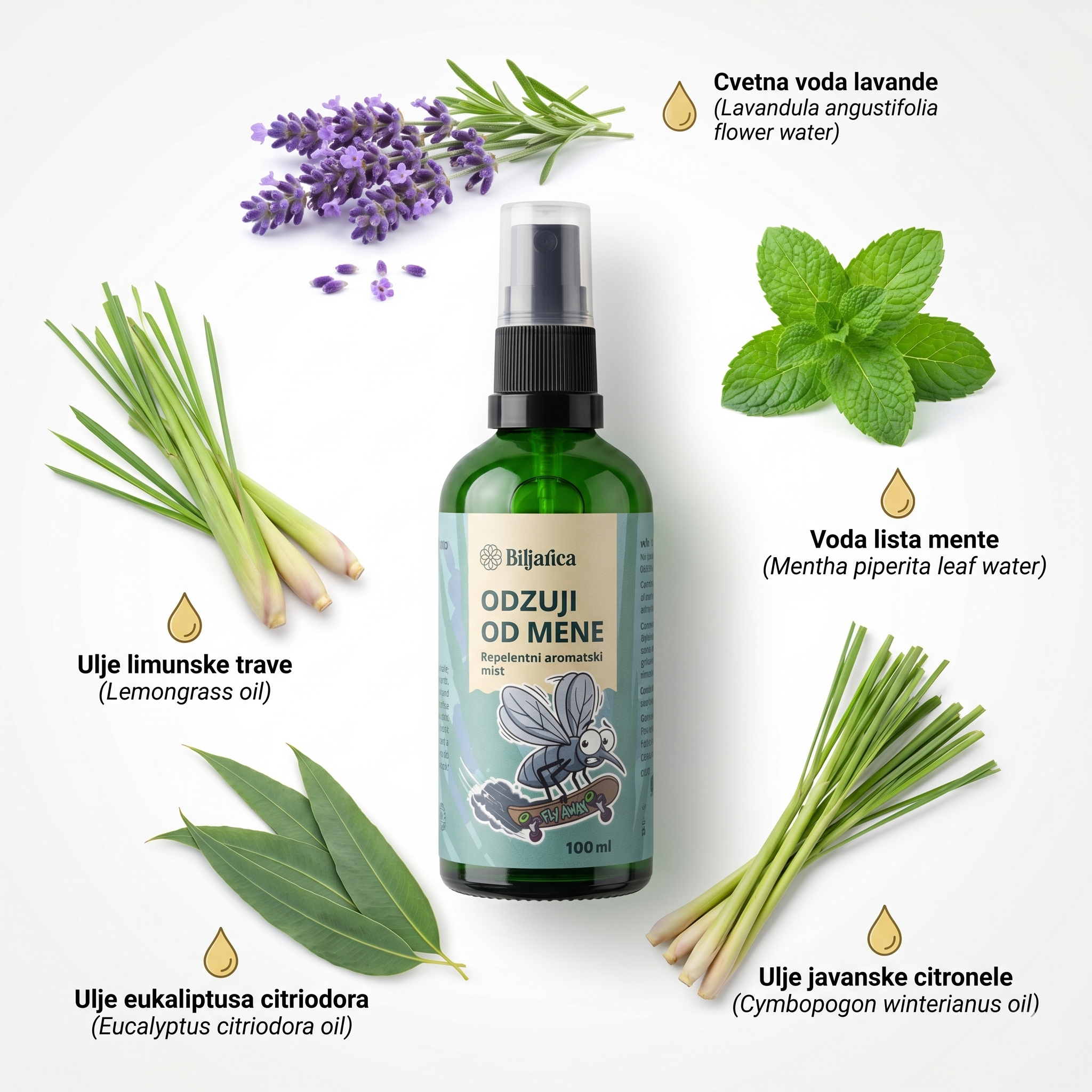 Formulacija kombinira aromatične i biljne komponente koje tradicionalno poznajemo u repelentnim pripravcima: